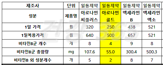 위 표는 참고로 제가 직접 만들어 보았는데요. 같은 일동제약에서 나온 비타민 B군 영양제의 가격과 성분에 대해서 한눈에 비교하실 수 있도록 만들어 보았습니다.