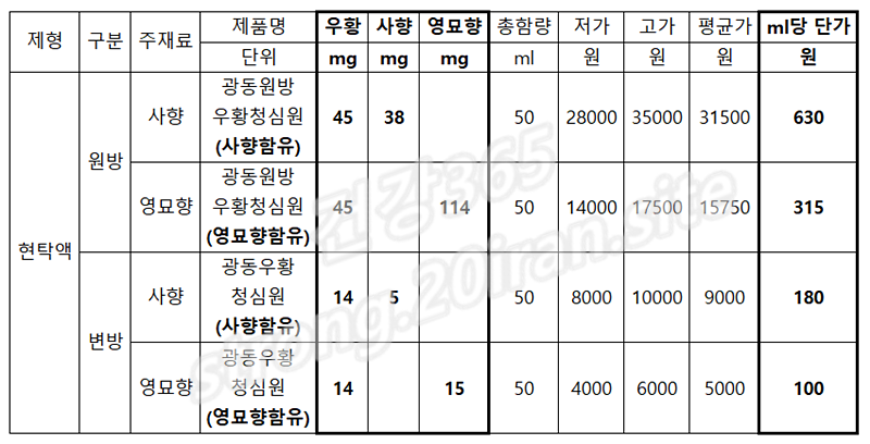 - 위 표를 보시면 아시겠지만, 가격 및 종류의 주요 차이는 원방 또는 변방, 사향 또는 영묘향 함유 여부에 따라 틀려집니다. 제일 좋은 약은 아무래도 원방에 사향을 함유한 우황청심원이 되겠죠.