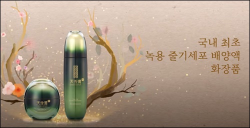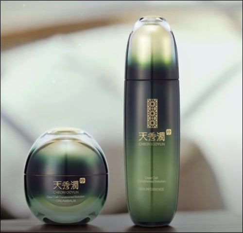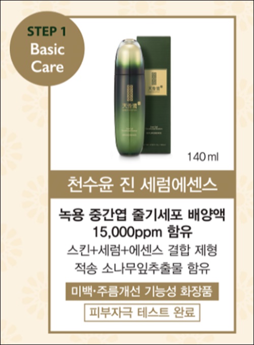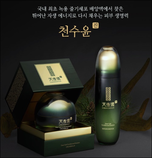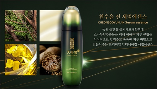 1) 천수윤진 세럼 에센스 (140ml) : 녹용 중간엽 줄기세포 배양액이 15,000ppm 함유되어 있으며, 스킨, 세럼, 에센스가 결합되어 있는 형태입니다. 적송 소나무 잎 추출물도 함유되어 있는 미백, 주름개선 기능성 화장품입니다.
