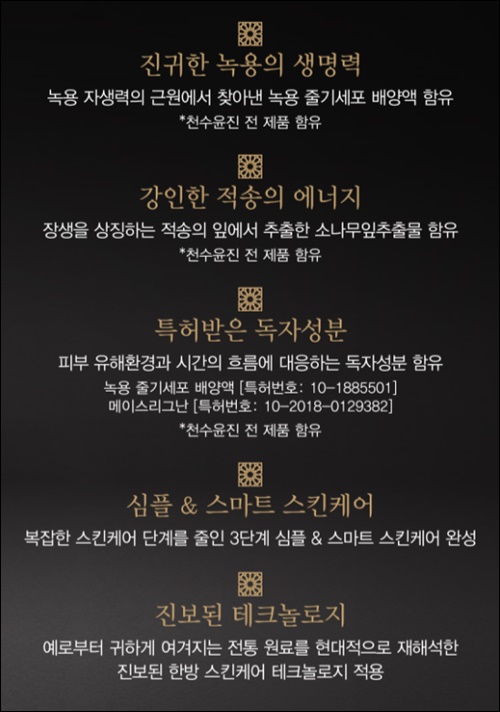 천수윤진은 기존 제품인 천수윤을 더 업그레이드한 제품으로 녹용 줄기세포 배양액의 진귀한 자생력을 제품에 담아내고 천연성분인 소나무 잎 추출물까지 함유하고 있는 고급 기능성 화장품입니다.