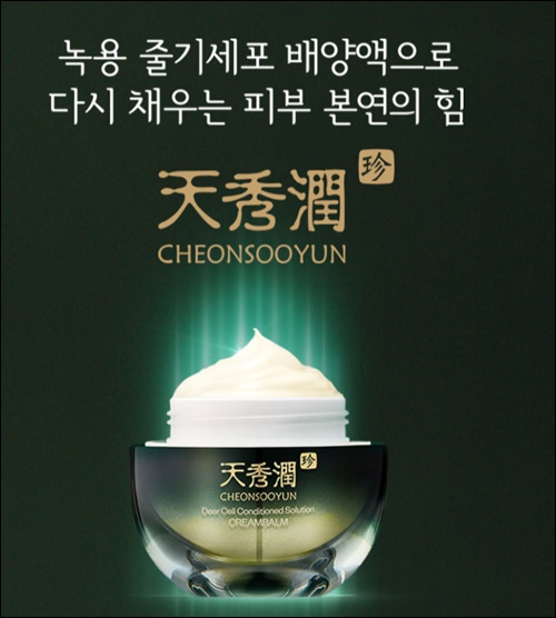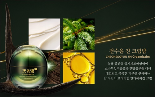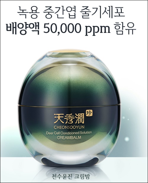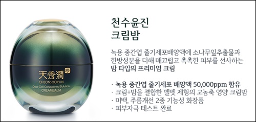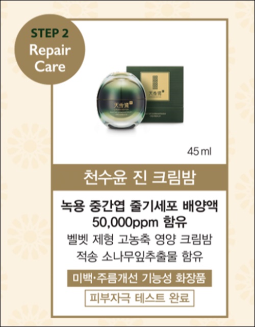 2) 천수윤진 크림밤(45ml) : 녹용 중간엽 줄기세포 배양액이 50,000ppm 함유되어 있는 벨벳 제형의 고농축 영양 크림방인데요. 에센스와 마찬가지로 적송 소나무 잎 추출물이 함유되어 있으며 미백. 주름개선 기능성 화장품으로 분류됩니다.