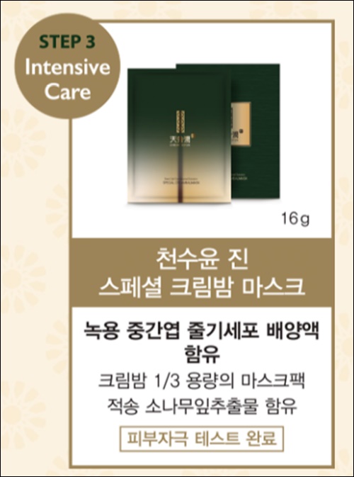 3) 천수윤진 스페셜 크림밤 마스크(16g) : 녹용 중간엽 줄기세포 배양액이 함유되어 있고 크림밤 용량의 1/3 이 들어가 있는 마스크팩입니다. 적송 소나무 잎 추출물이 함유되어 있습니다.