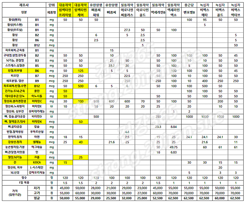 아래 비교표와 순위표는 인터넷과 일반약국을 통해서 필자가 직접 조사한 결과를 통해 분석한 자료입니다. 따라서, 예고 없이 변경될 수 있으며 시간이 경과함에 따라 신뢰도가 떨어질 수 있으니 단순 참고용으로만 봐주시기 바랍니다.