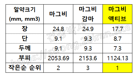 3. 마그비, 마그비감마, 마그비액티브 알약크기 비교