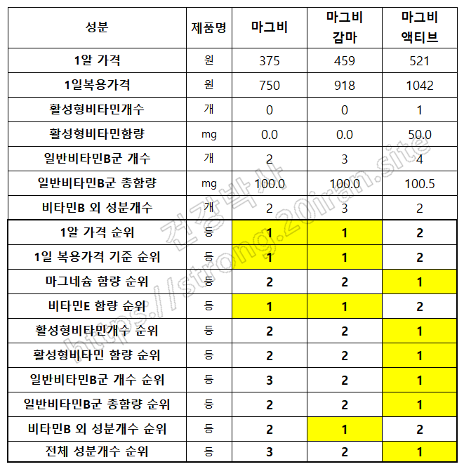 - 상기표에서 노란색 표시 부분은 세제품이 공통적으로 함유하고 있는 성분들입니다. 기본적으로 마그네슘, 비타민E 그리고 마그네슘 흡수와 이용에 도움이 되는 비타민 B6는 모두 포함되어 있습니다.