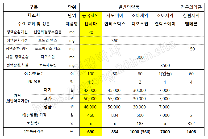 - 정맥순환 개선제로 잘 알려진 5가지 약품의 성분과 가격을 비교해 보았는데요. 센시아 같이 하루 1~2정 복용의 경우에는 1정 또는 2정 섭취할 수 있기 때문에 1일 복용량을 1.5일로 계산했습니다.